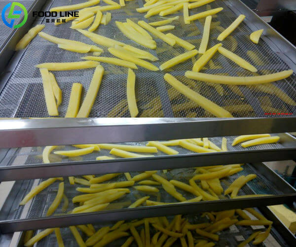 10. Fried fries are cooled to stabilize the product before freezing.